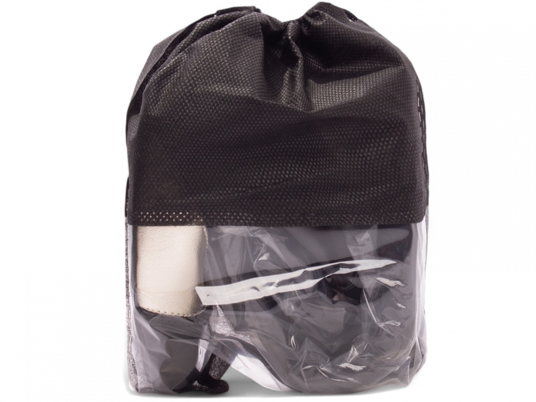 * A sapatilha vai dobrada dentro de um saco de material TNT na cor preto.
