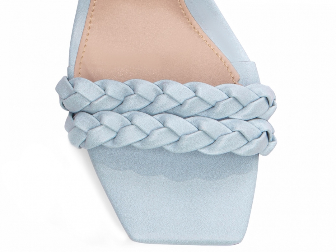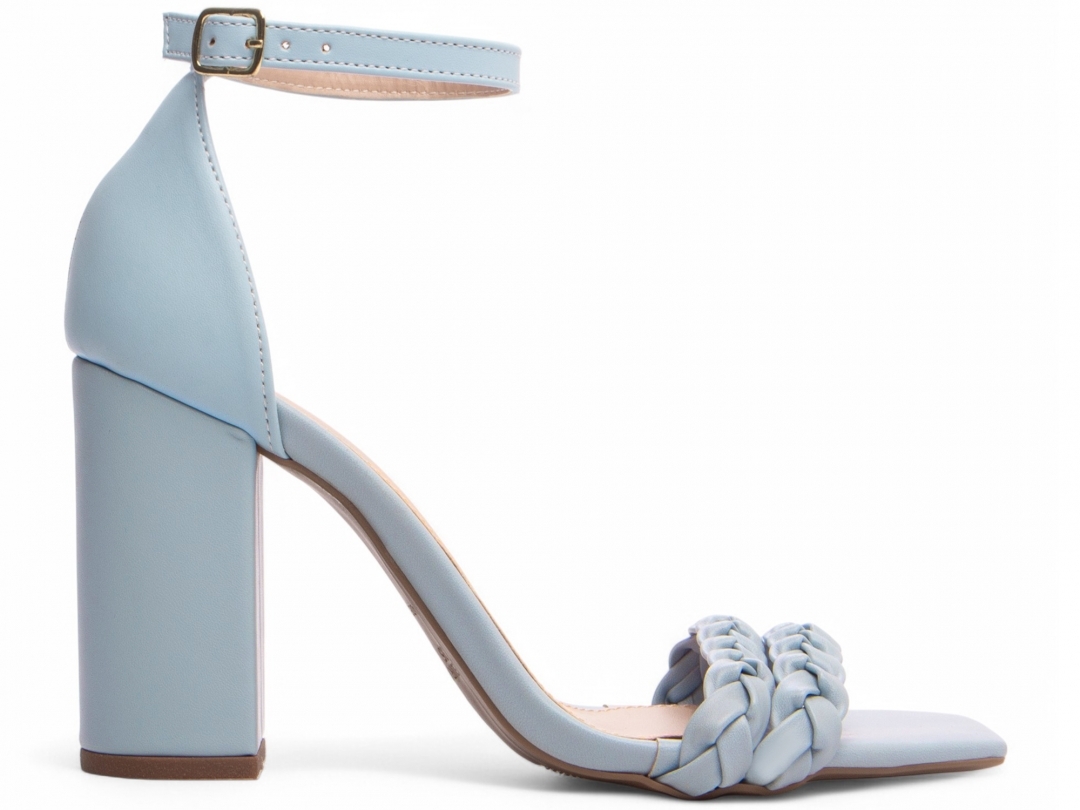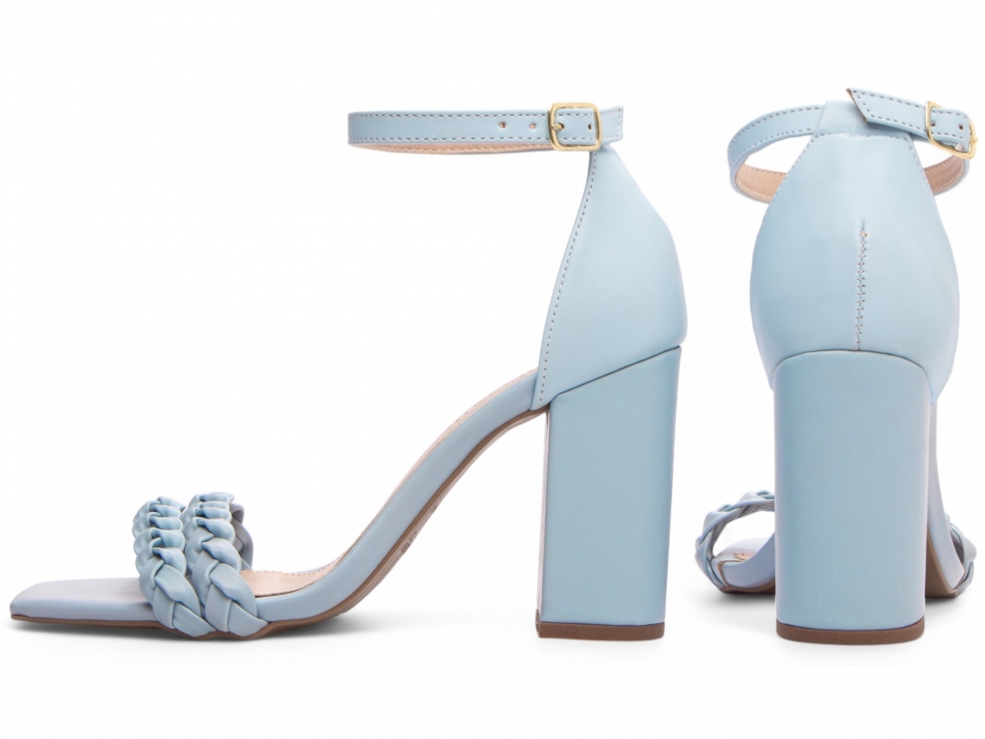 Enfeite: Tiras trançadas em Napa Azul e fivela de metal na cor dourado;