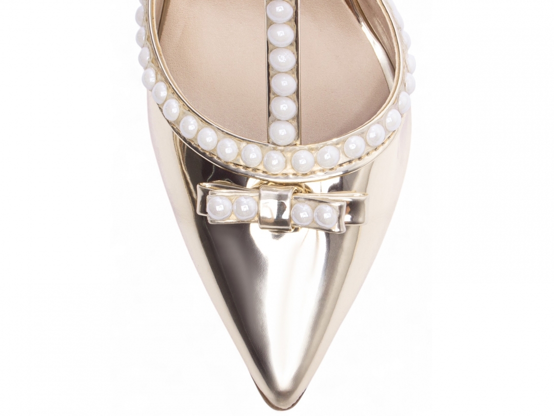 Palmilha: 8 mm de Espessura, Espuma em EVA, Revestida em Metalizado Speechio Ouro Light e Taloneira Napa Bege;